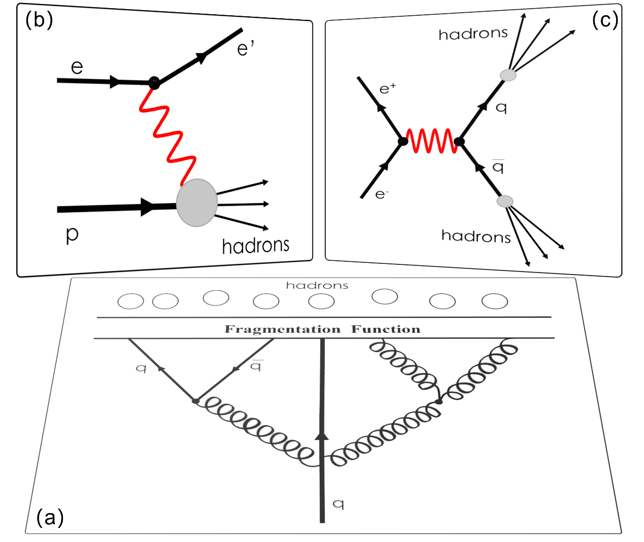 圖:(a)部分子碎裂至強(qiáng)子過程示意圖,(b)電子-質(zhì)子半單舉深度非彈性散射過程示意圖 (c)正負(fù)電子湮滅過程示意圖。