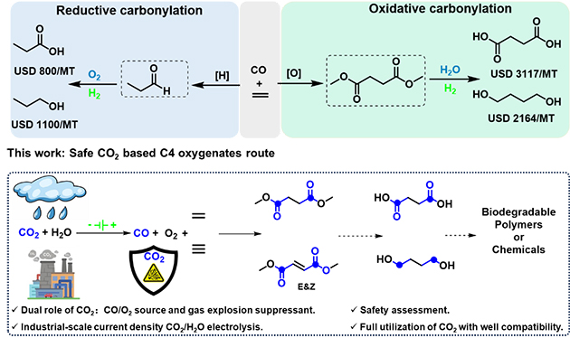 在此前氧化羰基化研究的基礎(chǔ)之上(Science,2024,386: 776-782;Angew Chem Int Ed,2020,59: 2080-2084;ACS Catal.,2023,13: 735-743;ChemSusChem,2022,15: e202102400;分子催化,2020,34,182–192;2024,38,297–308),研究人員通過一種CO2全利用策略,將CO2-H2O共電解生成的CO/O2作為原料,與乙烯/乙炔的氧化雙羰基化合成CO2基C4雙酯類化合物,如丁二酸二甲酯、富馬酸二甲酯和馬來酸二甲酯等,這類化合物在可降解聚合物(聚丁二酸二丁酯)、增塑劑、溶劑、表面活性劑、有機合成中間體等多個領(lǐng)域內(nèi)有著廣泛的用途。與傳統(tǒng)的烯/炔烴羰基化相比較,烯/炔烴氧化羰基化能同時插入兩個羰基,生成更有價值的化學(xué)品。此外,尚未電解的CO2可作為氣體抑爆劑,可消除或降低乙烯/乙炔氧化雙羰基化反應(yīng)過程中潛在的爆炸風(fēng)險。
