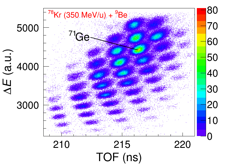 2350 MeV/u-78束流轟擊10 mm厚的鈹靶,RIBLL2束線磁剛度按目標(biāo)核鍺-71設(shè)置時(shí),氪-78碎裂