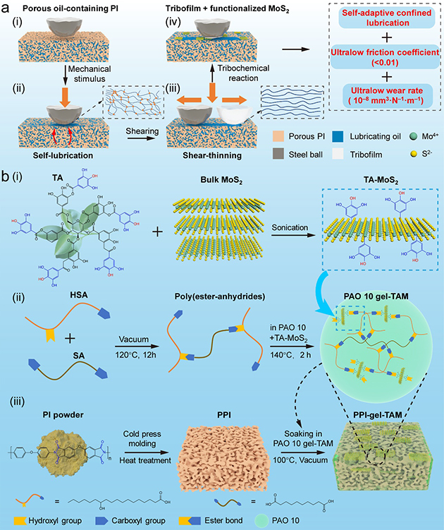 近期,中國科學(xué)院蘭州化學(xué)物理研究所潤滑材料全國重點(diǎn)實(shí)驗(yàn)室王道愛研究員團(tuán)隊(duì)基于"自適應(yīng)限域潤滑"的策略(圖1),設(shè)計(jì)制備了MoS2-油凝膠復(fù)合的多孔聚酰亞胺(PPI-gel-TAM),具有高的儲油能力(18.2%)和油保持率(97.7%),實(shí)現(xiàn)了鋼/PPI界面自適應(yīng)的宏觀超潤滑(摩擦系數(shù):~0.007)和超低的磨損率(2.81×10-8·mm3·N-1·m-1),展現(xiàn)出出色的摩擦學(xué)性能,為未來發(fā)展高性能的工程極限潤滑材料提供了新的見解和思路。