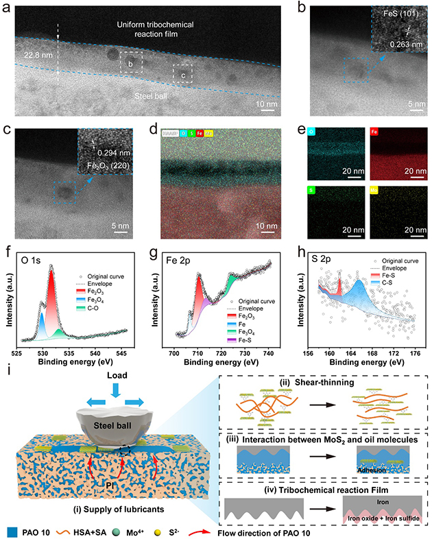 鋼/PPI界面宏觀超潤滑機(jī)理可歸因于四種機(jī)制的耦合作用,多孔結(jié)構(gòu)的儲油/釋放、潤滑劑的剪切變稀特性、功能化的二硫化鉬與油分子之間的相互作用以及摩擦保護(hù)膜的形成(圖2)。