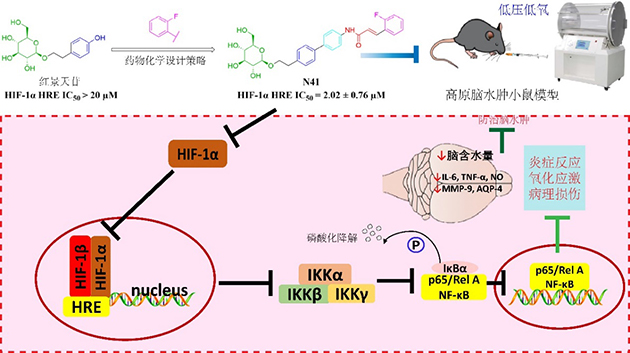 研究團(tuán)隊(duì)聚焦高原腦水腫防治重大問題,以高原特色中草藥紅景天中的活性成分紅景天苷為結(jié)構(gòu)基礎(chǔ),基于骨架躍遷和分子雜合的藥物設(shè)計(jì)策略,通過引入鄰氟苯基HIF-1α抑制劑藥效團(tuán),對(duì)紅景天苷的糖苷鍵、連接鏈、芳環(huán)取代基等三個(gè)部分進(jìn)行結(jié)構(gòu)修飾,設(shè)計(jì)并合成了多種紅景天苷衍生物開展構(gòu)效關(guān)系研究。通過雙熒光素酶報(bào)告基因、細(xì)胞毒、ELISA等實(shí)驗(yàn),篩選獲得強(qiáng)活性化合物N41,可顯著抑制HIF-1α HRE轉(zhuǎn)錄(IC50: 2.02 ± 0.76 μM),減少C8-D1A細(xì)胞炎癥因子IL-6和NO的表達(dá)以及ROS積累,減輕氧化損傷且無明顯細(xì)胞毒性。HACE小鼠模型研究發(fā)現(xiàn),N41可有效降低HACE模型小鼠腦含水量,改善缺氧導(dǎo)致的腦組織損傷,通過阻斷HIF-1α/IKKα/NF-κB信號(hào)通路,抑制下游TNF-α、IL-6等炎癥因子及MMP-9、AQP-4等血腦屏障通透性相關(guān)因子表達(dá),緩解炎癥反應(yīng)和維持血腦屏障完整性,發(fā)揮高原腦水腫防治功效。相關(guān)研究成果發(fā)表在European Journal of Medicinal Chemistry(2025,297: 117982)上。