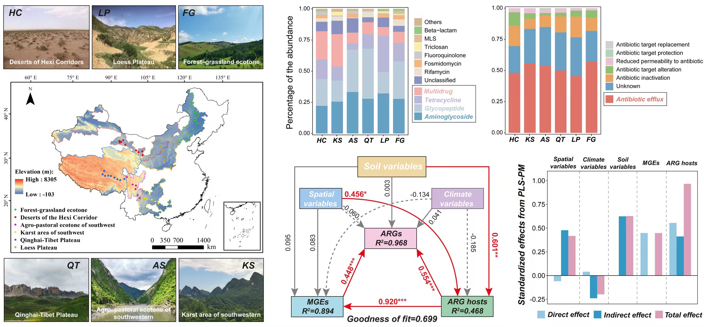 中國(guó)科學(xué)院西北生態(tài)環(huán)境資源研究院李玉強(qiáng)研究員團(tuán)隊(duì)在我國(guó)4300公里的范圍內(nèi),針對(duì)森林、草原、沙漠等六類典型陸地自然生態(tài)系統(tǒng),設(shè)立了42個(gè)采樣點(diǎn),運(yùn)用宏基因組學(xué)方法,系統(tǒng)揭示了表層土壤中ARGs的分布特征與傳播機(jī)制。