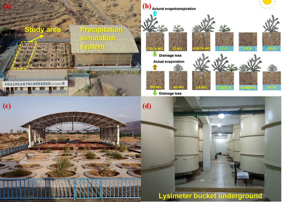 中國科學(xué)院西北生態(tài)環(huán)境資源研究院張志山研究員團(tuán)隊(duì),依托沙坡頭沙漠研究試驗(yàn)站的“中國北方沙區(qū)水量平衡自動(dòng)模擬監(jiān)測系統(tǒng)——沙坡頭蒸滲儀(Lysimeter)群”,采用其中12個(gè)大型稱重式蒸滲儀(填充土壤為騰格里沙漠的風(fēng)沙土,從裸沙到多種單一栽植及灌木與半灌木混合栽植),系統(tǒng)量化了2019年至2023年間不同沙漠生態(tài)系統(tǒng)(有無地下水)的水量平衡組分及植物生長動(dòng)態(tài)。