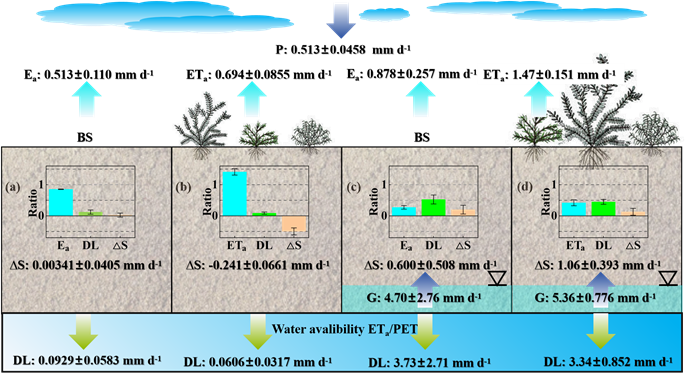 地下水與植物栽植對(duì)水量平衡各組分的影響。裸沙(a,c)和栽植植物的蒸滲儀(b,d)在無地下水條件(a,b)和有地下水條件(c,d)。Ea: 實(shí)際蒸發(fā)量;ETa: 實(shí)際蒸散發(fā)量;?S: 土壤水儲(chǔ)量變化;DL:滲漏量。
