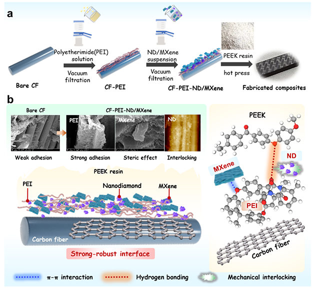 針對深海特異性損傷機理,課題組創(chuàng)新性地提出了一種強韌化界面增強策略。研究人員采用真空輔助壓力滲透技術,在碳纖維織物表面成功構筑了一種“剛-柔”并濟的雜化強韌界面結構(圖2)。以聚醚酰亞胺為柔性相,發(fā)揮柔性粘接與應力緩沖作用;以納米金剛石和二維MXene為剛性相提供物理阻隔與機械互鎖點,協(xié)同抑制海水滲透擴散、促進應力高效傳遞(圖4,5)。