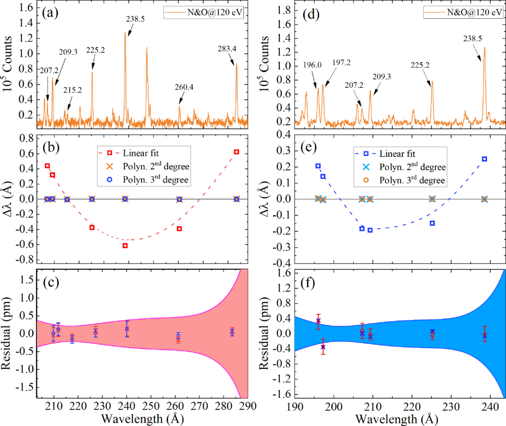 圖2. (a, d)分別為類鈹 S12+和Cl13+離子的??坦庾V;(b, d)分別為S12+和Cl13+離子的離子色散函數的殘差圖;(c, f) 為殘差放大圖和1-σ置信區(qū)間;