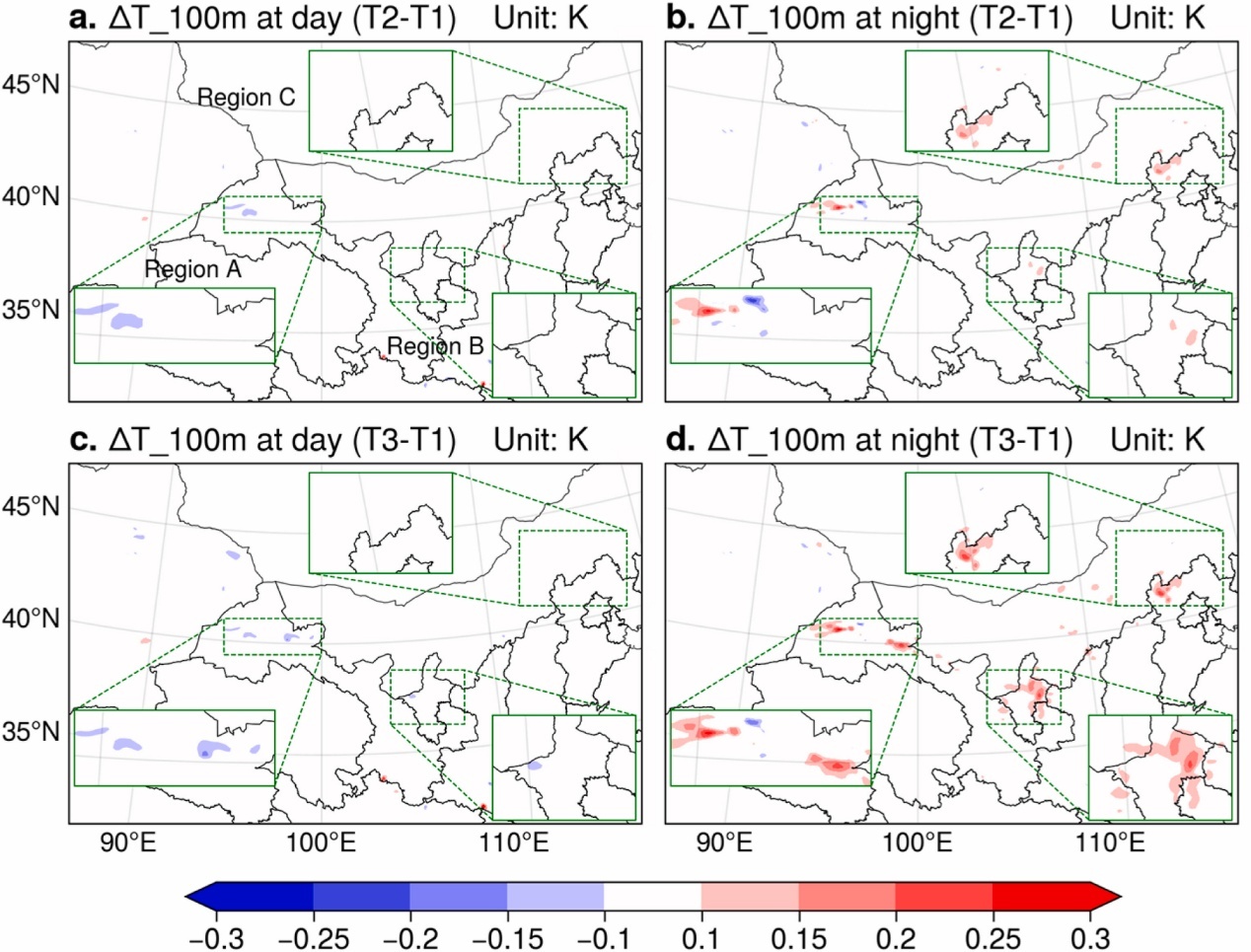 大型風(fēng)電場群對100米高度處年平均氣溫的影響(a, c)白天,(b, d)夜間