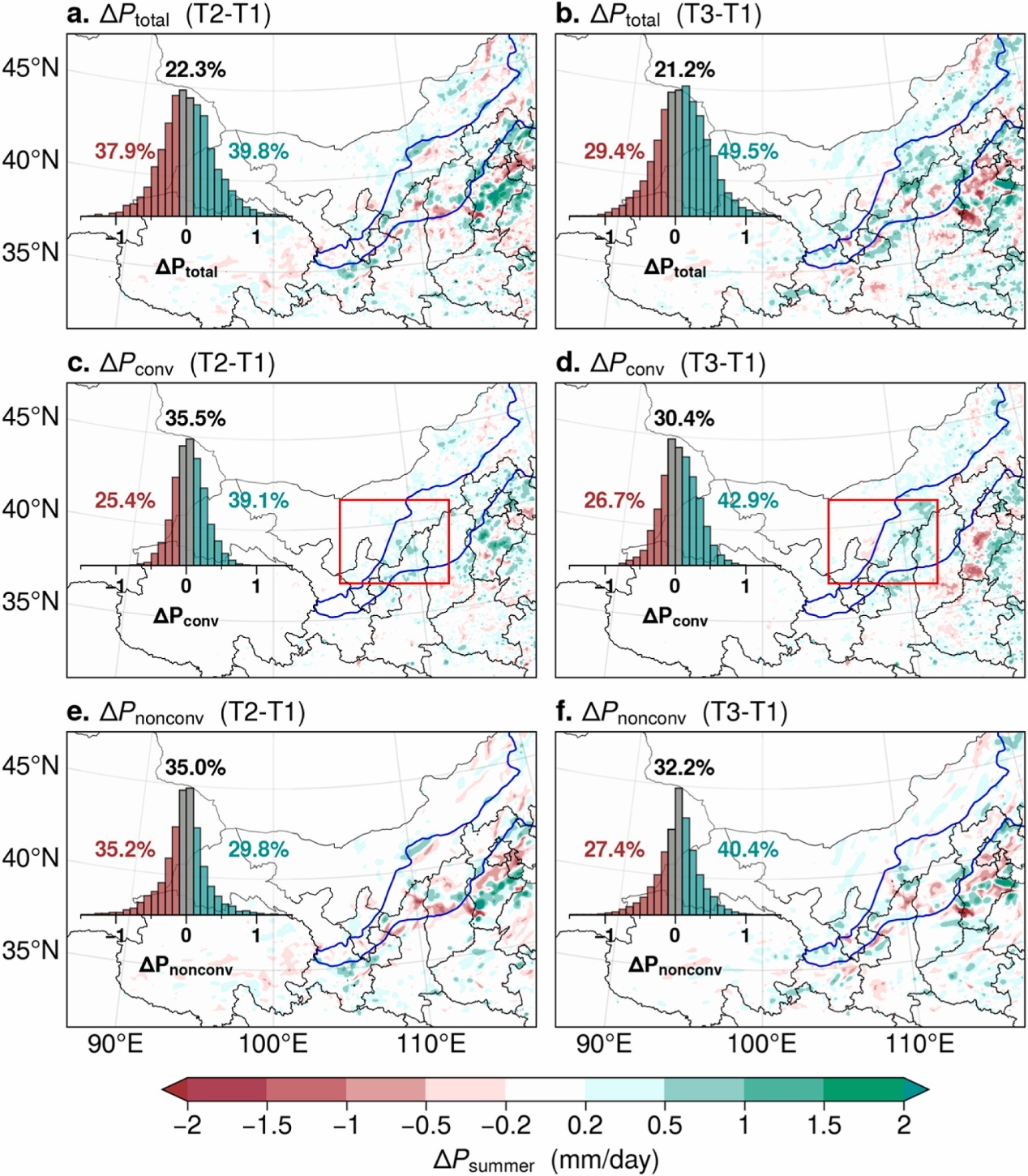 大規(guī)模風(fēng)電場群對夏季(a, b)總降水量、(c, d)對流性降水量及(e, f)非對流性降水量的影響