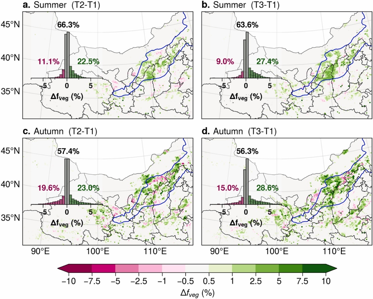 大規(guī)模風(fēng)電場群建設(shè)前后植被覆蓋度差異的空間分布(a, b)夏季,(c, d)秋季