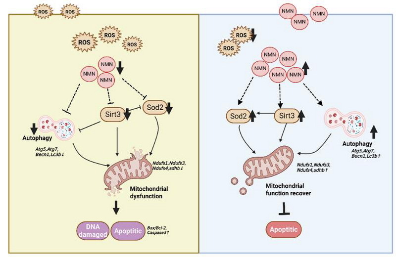 文章模式圖:胚胎期低氧通過(guò) Sirt3/sod2 通路導(dǎo)致卵母細(xì)胞氧化應(yīng)激損傷,而煙酰胺單核苷酸添加可以部分恢復(fù)卵母細(xì)胞及卵巢功能