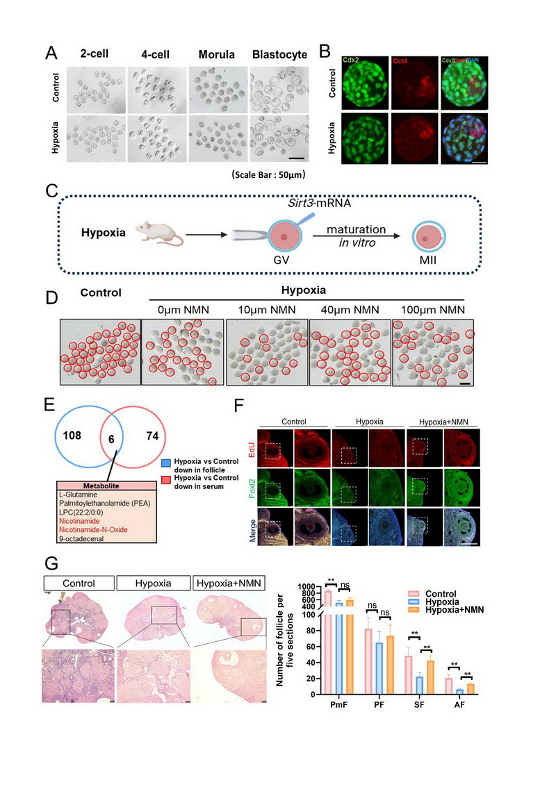 文章代表圖:(A)對(duì)照組與低氧組 2-細(xì)胞、4 -細(xì)胞、桑椹胚及囊胚期小鼠胚胎代表圖片(標(biāo)尺:50 μm)。(B)對(duì)照組與低氧組囊胚中滋養(yǎng)層細(xì)胞標(biāo)記物 Cdx2(綠色)、內(nèi)細(xì)胞團(tuán)標(biāo)記物 Oct4(紅色)及核標(biāo)記 DAPI(藍(lán)色)的免疫熒光共定位結(jié)果。(3)Sirt3 mRNA顯微注射低氧GV 期卵母細(xì)胞,進(jìn)行Sirt3過(guò)表達(dá)實(shí)驗(yàn)。 (D) 對(duì)照組及低氧組卵母細(xì)胞在不同濃度 NMN 體外處理后的成熟情況對(duì)比(紅色圈標(biāo)記成熟卵母細(xì)胞,標(biāo)尺:50 μm)。(E)低氧組與對(duì)照組卵泡液及血清中差異代謝物的交集分析,下方列出 6 個(gè)核心重疊差異代謝物。(F)對(duì)照組、低氧組及低氧 + NMN 組卵巢組織中增殖標(biāo)記物 EdU(紅色)、顆粒細(xì)胞分化標(biāo)記物 Foxl2(綠色)及 Merge 圖的免疫熒光結(jié)果(白色虛線框?yàn)榫植糠糯髤^(qū)域,標(biāo)尺:200 μm)。(G) 卵巢組織形態(tài)學(xué)分析與卵泡計(jì)數(shù):對(duì)照組、低氧組及低氧 + NMN 組卵巢組織 H&E 染色結(jié)果(左圖,標(biāo)尺為400 μm);各組原始卵泡(PmF)、初級(jí)卵泡(PF)、次級(jí)卵泡(SF)及有腔卵泡(AF)在 5 張連續(xù)切片中的數(shù)量統(tǒng)計(jì)(右圖)。