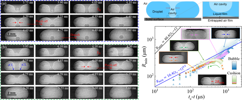 固液界面相互作用涉及典型的多尺度界面現(xiàn)象與流動過程,液滴撞擊固體表面時會沿中心軸產(chǎn)生圓柱形氣腔,并在液滴下方捕獲一層空氣薄膜。傳統(tǒng)觀點認(rèn)為這層氣膜在影響撞擊結(jié)果中起關(guān)鍵作用。之前的研究僅發(fā)現(xiàn)慣性主導(dǎo)的軸向內(nèi)爆導(dǎo)致氣腔夾斷并演化為氣泡,而對不形成氣泡的情況并不清楚,對氣腔與氣膜的相互作用也不了解。由于動態(tài)液滴中存在多個液氣界面和復(fù)雜的構(gòu)型變化,傳統(tǒng)光學(xué)成像方法無法深入解析多界面動力學(xué)。