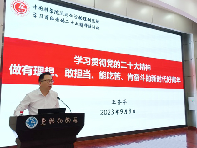 蘭州化物所黨委書記王齊華作了題為“學(xué)習(xí)貫徹黨的二十大精神 做有理想敢擔當能吃苦肯奮斗的新時代好青年”的專題黨課,并對全體研究生同學(xué)提出希望和要求。希望同學(xué)們以習(xí)近平新時代中國特色社會主義思想為指導(dǎo),認真學(xué)習(xí)領(lǐng)會黨的二十大精神、習(xí)近平總書記關(guān)于科技創(chuàng)新的重要論述和指示批示精神。面向世界科技前沿、面向國家重大需求、面向國民經(jīng)濟主戰(zhàn)場、面向人民生命健康,刻苦鉆研,勇于創(chuàng)新,大力傳承弘揚科學(xué)家精神,培養(yǎng)高尚的品格、積淀豐厚的學(xué)養(yǎng)、保持良好的心理狀態(tài),努力成長為對國家、對民族有用的創(chuàng)新人才,把個人的理想追求融入黨和國家事業(yè)之中,為早日實現(xiàn)高水平科技自立自強貢獻青春力量和智慧。