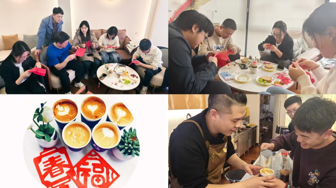 活動(dòng)現(xiàn)場,同學(xué)們專注體驗(yàn)剪紙的魅力、興奮展示各自的剪紙成果?,F(xiàn)場洋溢著濃厚的節(jié)日氛圍,每一片窗花、每一個(gè)“?!弊?,每一份新年寄語都承載著大家對新一年的美好期盼。隨后,大家在咖啡師的現(xiàn)場教學(xué)下投入到咖啡拉花制作,感受咖啡制作的樂趣。